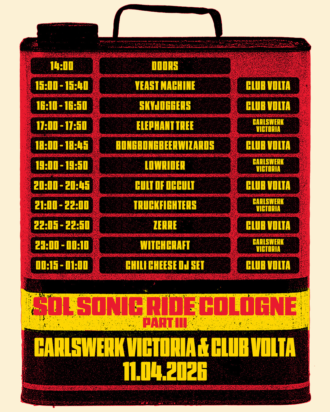 SOL Sonic Ride Cologne is a one-day heavy music festival presented by the underground record label and booking agency Sound Of Liberation, bringing together leading acts from the Stoner, Doom, and Psychedelic Rock scenes. The event takes place at Carlswerk Victoria and the neighboring Club Volta in Cologne, offering a full day of powerful riffs, fuzzy grooves, and immersive live performances across two stages. Featuring an international lineup of bands from across the heavy underground, SOL Sonic Ride Cologne celebrates the spirit of the global Stoner and Psych community in an intense festival atmosphere. After the sold-out first edition in 2025 – celebrating 20 years of Sound of Liberation – the heavy music scene gathering comes back with a massive lineup for a second ride on Saturday April 11th 2026!